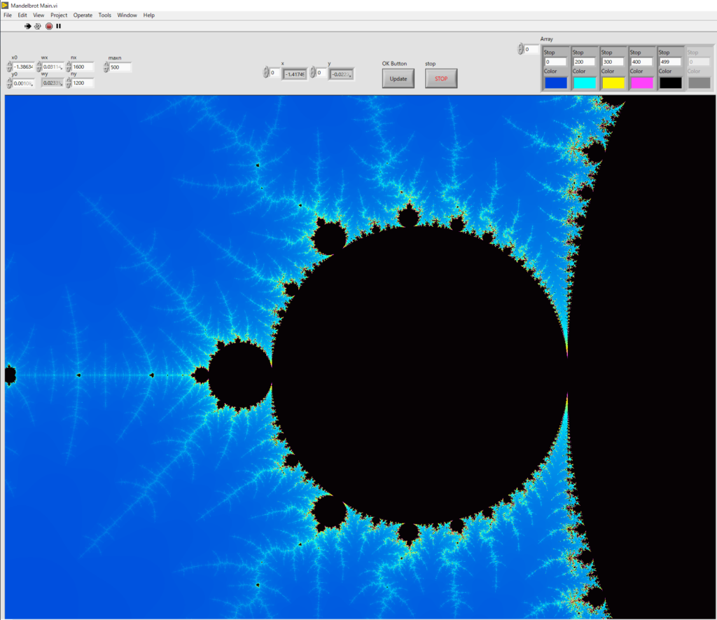こういうやつである。高精細な画像を生成するにはそこそこのCPUスペックが必要であるため、かつてはベンチマークにも使用されたらしいが、今はCPUも早いので上記程度であればさほど時間がかからずに計算できる。今日はこれをLabVIEWで実装したので紹介する。